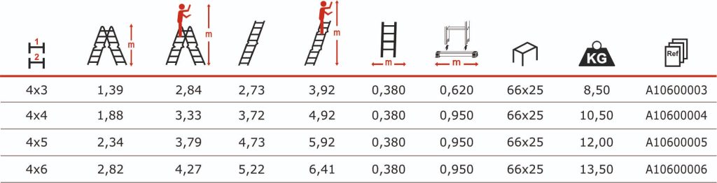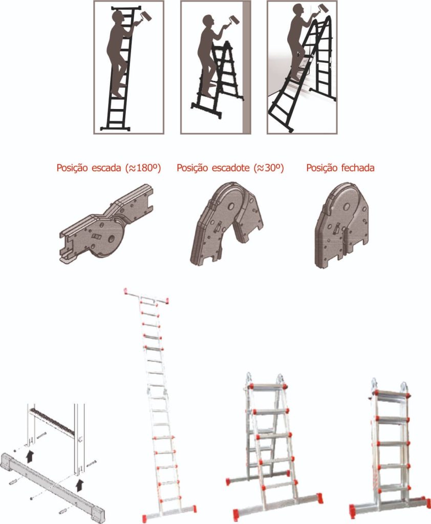 Extremamente versátil e de posicionamento rápido Peso reduzido Fácil de manusear, transportar e armazenar Utilização em pisos desnivelados Sistema de segurança autobloqueio para as diversas posições Regulação de altura através de dispositivo de bloqueio no degrau Limitador de extensão