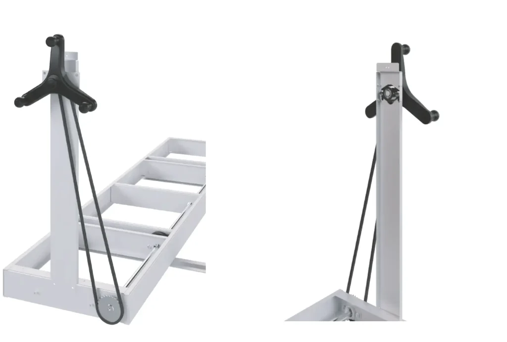 Os charriots metálicos sobre os quais assentam as estantes são de chapa Dd11 (norma EN10111) de 3 mm de espessura,de capada e oleada, formando um chassis rígido. O avanço é feito por accionamento manual do volante com três hastes com punhos rotativos cujo diâmetro de rotação é de 400mm. A transmissão é realizada por rodas dentadas e correntes de aço, que giram sobre um eixo metálico que se une, em série, com as demais rodas motrizes.